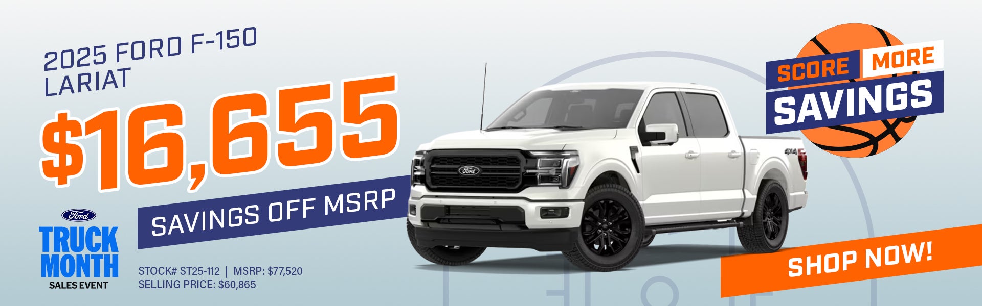 Stock # ST25-112, 2025 Ford F-150 Lariat. Image is for illustrative purposes only. MSRP: $77,520; -$1,000 Truck Month Bonus; -$2,000 Consumer Cash; -$500 Retail Bonus; -$5,955 Dealer Discount; -$7,200 Additional Incentives = Selling Price: $60,865. Not available with special financing, lease and some other offers. See dealer for details and qualifications. Expires 03/31/2026.